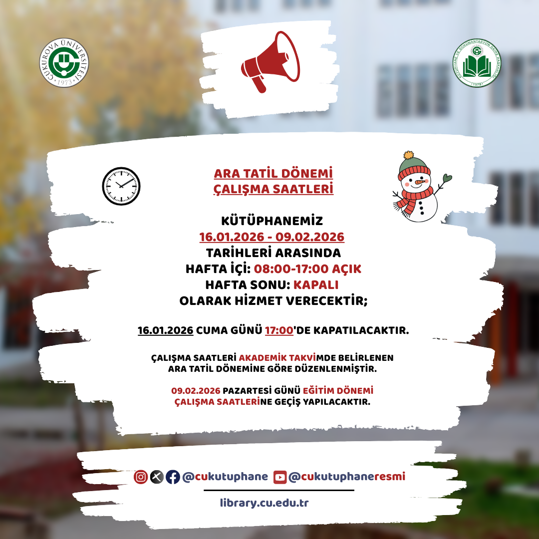 Kütüphanemiz 16.01.2026 - 09.02.2026 tarihleri arasında hafta içi: 08:00-17:00 açık; hafta sonu: kapalı olarak hizmet verecektir; 16.01.2026 cuma günü 17:00'de kapatılacaktır.