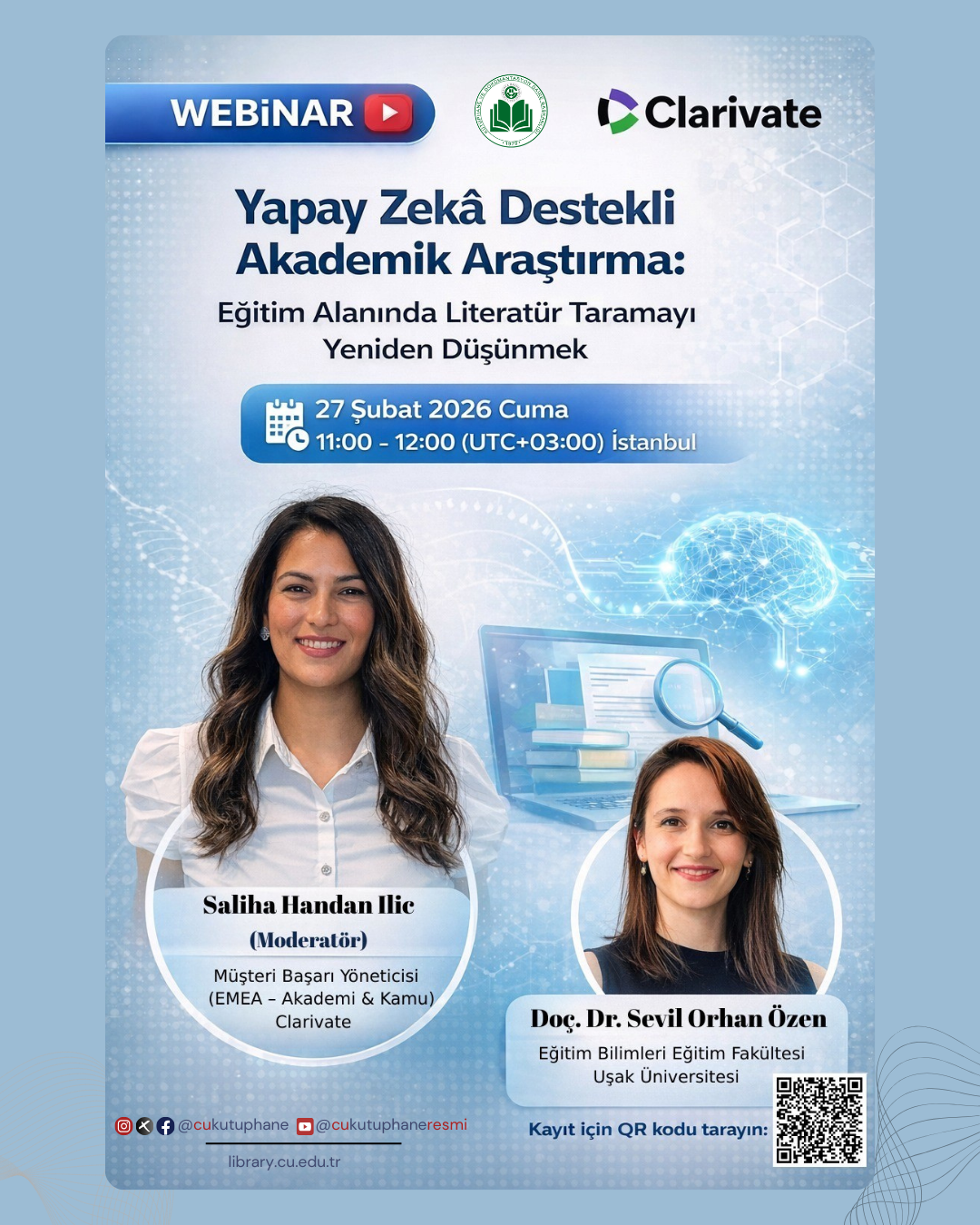 Bu webinarda, Uşak Üniversitesi’nden Doç. Dr. Sevil Orhan Özen ile birlikte, eğitim alanında çalışan araştırmacı ve öğrencilerin literatür tarama süreçlerini yapay zekâ destekli araçlarla nasıl daha verimli, daha sistematik ve daha derinlikli hâle getirebileceklerini ele alacağız. ProQuest Dissertations & Theses (PQDT) veritabanındaki yeni yapay zekâ özellikleriyle akademik araştırma deneyiminin nasıl dönüştüğünü uygulamalı örneklerle göstereceğiz."